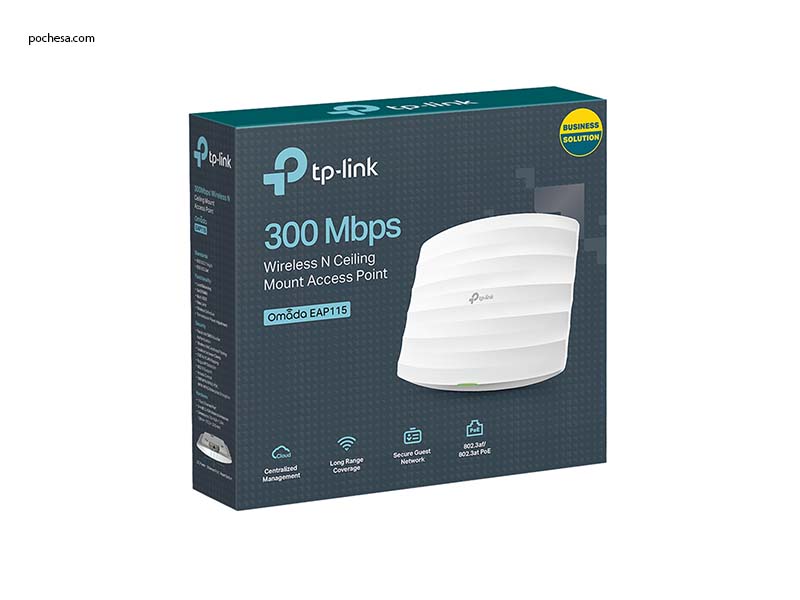 The TP‑Link EAP115 is a 300 Mbps 2.4 GHz Wireless N ceiling‑mount access point with dual internal 4 dBi omni antennas, powered via 802.3af PoE and fully managed via TP‑Link’s Omada SDN.